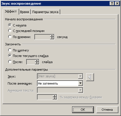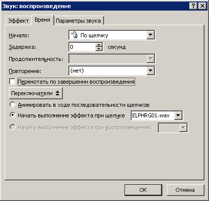 Данное окно открыто на вкладке Время и, следовательно, здесь настраиваются временные параметры звучания звука (начало, окончание, число повторов и др.). Остальные, возможные в программе, настройки звука приведены на вкладке Эффект (рис. 5.6). Здесь все настолько очевидно, что подробные комментарии не требуются.