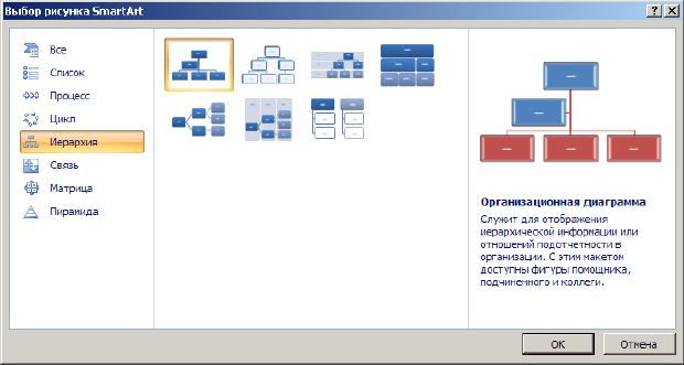 Для практического создания организационной диаграммы в Microsoft Office PowerPoint 2010 на вкладке Вставка в группе Иллюстрации нажмите на кнопку SmartArt. В коллекции Выбор рисунка SmartArt нажмите на кнопку Иерархия (рис. 6.18), после этого выберите макет организационной диаграммы, например, Организационная диаграмма, а затем нажмите кнопку ОК (рис. 6.19).