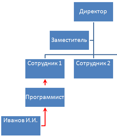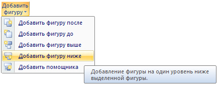 · Вставить фигуру на один уровень ниже выделенной фигуры (команда Добавить фигуру ниже). При этом фигура будет добавлена за остальными фигурами этого уровня.