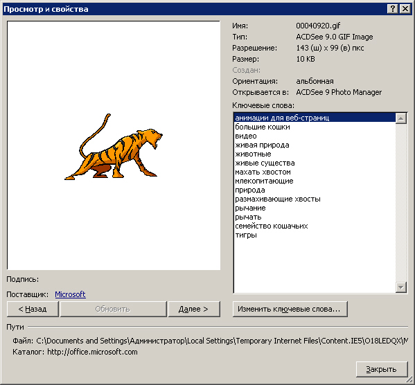 Перед добавлением клипа в презентацию его можно предварительно просмотреть. В области задач Клип в поле Результаты, в котором перечислены доступные клипы, наведите указатель мыши на эскиз клипа, щелкните отобразившуюся стрелку и выберите Просмотр и свойства (рис. 7.4).
