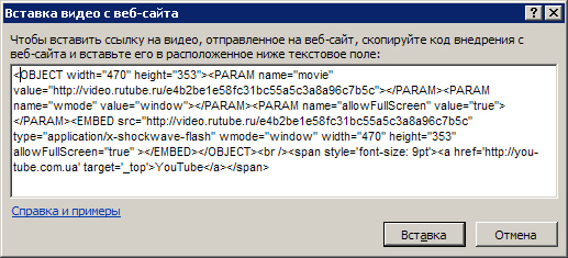 В PowerPoint на вкладке Вставка в группе Мультимедиа щелкните стрелку под надписью Видео и выберите команду Вставка видео с веб-сайта. В диалоговом окне Вставка видео с веб-сайта вставьте код внедрения и нажмите на кнопку Вставить - рис. 7.7.