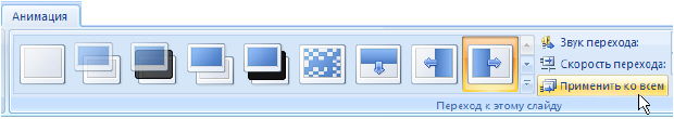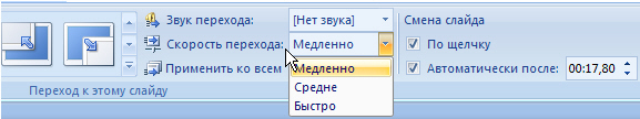 Для добавления одинакового перехода между слайдами ко всем слайдам презентации в области, в которой содержатся вкладки Структура и Слайды, щелкните на вкладку Слайды. Затем на вкладке Главная щелкните на эскиз слайда. Далее на вкладке Анимация в группе Переход к следующему слайду выберите эффект смены слайдов. А чтобы установить скорость смены слайдов, в группе Переход к этому слайду щелкните на стрелку около кнопки Скорость перехода, а затем выберите нужную скорость (медленно, средне, быстро) - рис. 7.19. В группе Переход к этому слайду нажмите на кнопку Применить ко всем.