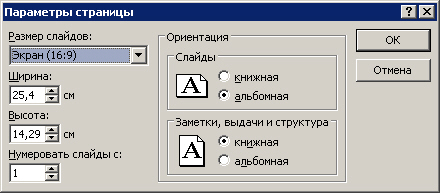 · Перейдите на вкладку Дизайн и откройте диалоговое окно Параметры страницы. Из списка Размер слайда выберите размер Экран (16:9) - рис. 8.6.