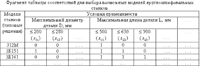 Множество возможных вариантов моделей круглошлифовальных станков определяется с помощью таблиц соответствий. Фрагмент такой таблицы приведен ниже в табл. 10.1.