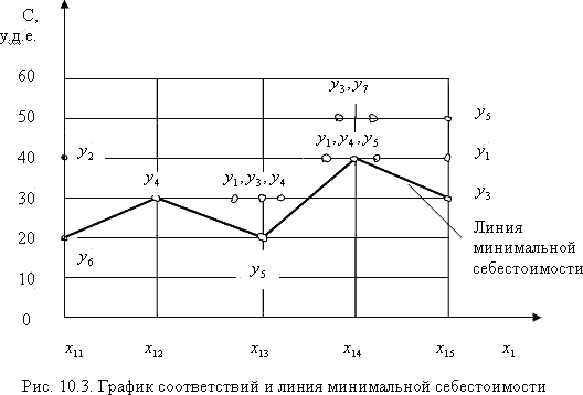 Построим график соответствий для одного из условий применимости, например, для первого – см. табл. 10.1. Критерий оптимизации – себестоимость
