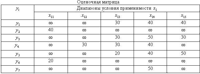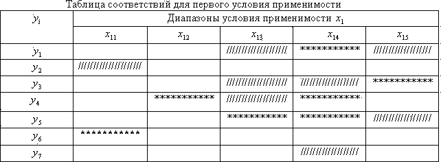 - диапазоны условий применимости. Пусть количество типовых решений (моделей станков) равняется не трем, а семи, количество диапазонов в первом условии применимости – пять.
