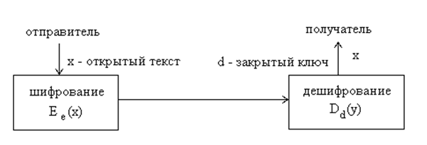 е – открытый ключ получателя, может быть опубликован где угодно.