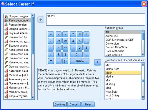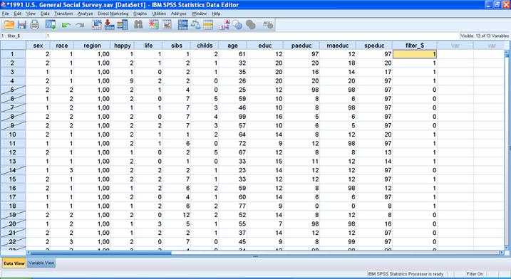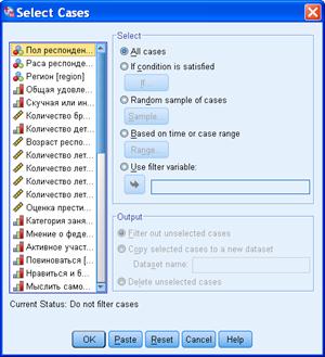 Filter_$. Эта переменная состоит только из нулей и единиц, причем единицы стоят у отобранных респондентов, а нули – у тех, кто в анализе принимать участие не будет.