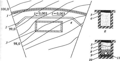 Рис. 5.3. Водоотвод с помощью: о — обвалования площадки; б — обычного дренажа; в — дренажа с перфорированной трубой; i — уклон; 1 — земляное обволование; 2— водоотводная канава; 3— котлован; 4 — строительная площадка; 5 — местный грунт; 6 — дренирующий материал; 7, 8 — соответственно мелко- и крупнозернистый песок; 9 — граций; 10 — уплотнительный слой; 11 — перфорированная (с отверстиями) труба