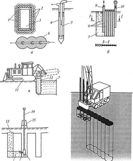 Рис. 5.4. Искусственное ограждение выемок от грунтовых вод: а — схема замораживания грунта; б — устройство противофильтрационного экрана с применением шпунтин-инъекторов; в, г — то же, с применением буровых машин и водовоздушной струи; д — устройство грунтобетонного экрана; 1 — замораживающие колонки; 2 — столбы смерзшегося грунта.; 3 — котлован; 4 — наружная труба; 5 — внутренняя труба; 6— поверхность замороженного грунта; 7— суспензия; 8 — трубы для подачи суспензии; 9 — шпунтина, извлекаемая из грунта; 10 — то же, погружаемая; 11 — трактор; 12 — рабочий орган с барами; 13 — вытесненный на поверхность грунт; 14— штанга; 15 — направляющая; 16— инъекторная головка; 17 — мониторная головка