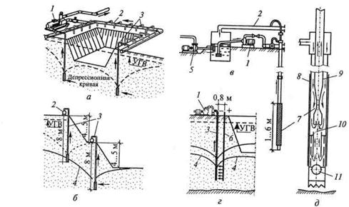 В легких иглофильтровых установках (ЛИУ) вода откачивается через одну трубу обычными методами, в эжекторных иглофильтровых установках (ЭИУ) каждый иглофильтр состоит из двух труб, вода, наоборот, закачивается и, проходя по специальному приспособлению — эжектору, создает разряжение воздуха (рис. 5.6, в, д).