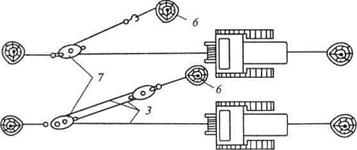 Рис. 5.7. Корчевка пней тракторной треловочно-корчевальной лебедкой: а — корчевка прямой тягой; б — корчевка при помощи двойного и тройного полиспаста; 1 — корчуемый пень; 2 — анкерный канат; 3 — тяговый канат; 4 — трактор с лебедкой; 5 — анкерный пень; 6 — вспомогательный анкерный пень; 7 — блок