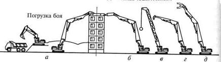 Рис. 5.8. Снос строений с помощью экскаваторов, оборудованных: а — ковшом; б — гидравлическим молотом; в — шар-бабой; г — разламывателем; д — гидроножницами