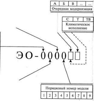 Рис. 5.12. Схема маркировки одноковшовых универсальных экскаваторов: ЭО — экскаватор одноковшовый универсальный; С — северное исполнение; Т — тропическое исполнение; ТВ — тропическое влажное исполнение; Г — гусеничное ходовое устройство с минимально допускаемой поверхностью гусениц; ГУ — гусеничное ходовое устройство с увеличенной поверхностью гусениц; П — пневмоколесное ходовое устройство; СШ — специальное шасси автомобильного типа; А — шасси грузового автомобиля; Тр — трактор; Пр — прицепное ходовое устройство; Пл — плавучее ходовое устройство