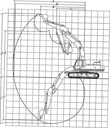 Рис. 5.13. Диаграмма основных технических параметров одноковшового экскаватора: А — максимальный радиус резания; В — максимальный радиус копания; С — наибольшая глубина копания; D — максимальная высота копания; Е — наибольшая высота разгрузки; F — наибольшая глубина резания; G — минимальный радиус разгрузки; К — радиус разгрузки при высоте Е