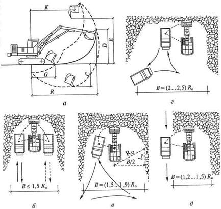 Транспорт может подаваться по дну выемки или поверху с одной или двух сторон. Глубина забоя определяется длиной рукояти экскаватора. Ширина торцевой проходки при двухсторонней погрузке самосвалов (1,6... 1,7)R0, при односторонней — (1,2... 1,5)R0.При работе в отвал ширина проходки бывает меньше — (0,5...0,8)Ro. При боковой проходке автотранспорт под погрузку может подаваться по верху или по дну котлована, с правой или левой стороны (рис. 5.16).