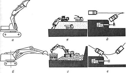«обратная лопата»: а, б — с жесткой и гибкой подвеской; в — разработка грунта в материковом залегании с установкой транспорта выше и ниже стоянки экскаватора; г — разработка предварительно разрыхленного грунта; д, е — варианты подъезда автомашин
