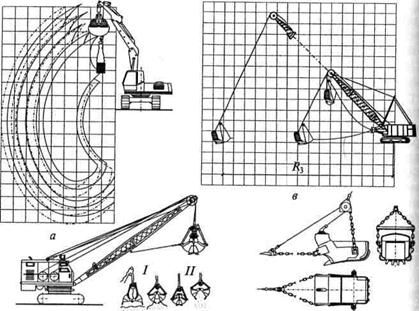 Экскаваторы с грейферным ковшом применяют при разработке узких или глубоких выемок (траншей, колодцев) в мягких и сыпучих грунтах, в том числе при высоком уровне грунтовых вод. Ковш может быть установлен на рукояти или подвешен ил решетчатой стреле, грунт набирается с использованием гидравлического привода или врезания в грунт тяжелого ковша (рис. 5.17, а, б). Гидравлическая система привода позволяет разрабатывать плотные грунты легкими ковшами, что дает возможность за один цикл экскавации набирать в ковш больше грунта. Производительность экскаваторов с таким оборудованием значительно повышается. При отрывке небольших в плане, глубоких выемок экскаватор, оборудованный грейферным ковшом, работает без перемещений. При отрывке траншей он перемещается вдоль траншеи, поэтому подъезд транспорта может осуществляться с любой свободной стороны.