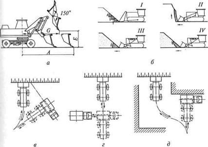 Рис. 5.19. Схемы разработки грунта одноковшовыми погрузчиками: а — на пневмоходу; б — на гусеничном ходу; в, г, д — соответственно поворотная, челночная и совмещенная схемы разработки грунта