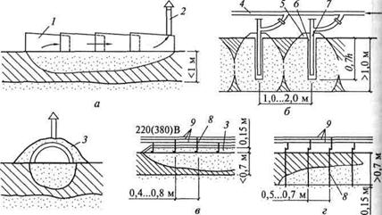 Рис. 5.29. Схемы оттаивания грунта: а — огневым способом; 6 — паровыми иглами; в, г — горизонтальными и вертикальными электродами; 1 — камера сгорания; 2 — вытяжная труба; 3 — слой грунта (опилок); 4 — паропровод; 5 — колпак; 6 — скважина; 7 — паровая игла; 8 — электрод; 9 — трехфазная электросеть