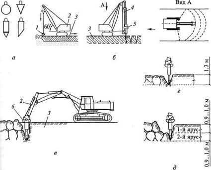Рис. 5.30. Рыхление мерзлого грунта: а — молотом свободного падения; б, в — то же, дизель-молотом и гидромолотом; г, д— при глубине промерзания до и более 1,5 м; J — молот; 2 — экскаватор; 3 — мерзлый слой грунта; 4 — направляющая штанга; 5 — дизель-молот; 6— гидромолот