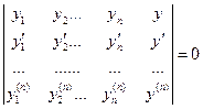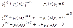 Покажем, что всякой системе n непрерывно дифференцируемых и линейно независимых в интервале (a,b) функций y1,..., yn, вронскиан которых отличен от нуля в интервале (a,b), соответствует лишь одно уравнение L[y] = 0, для которого эта система функций будет фундаментальной.