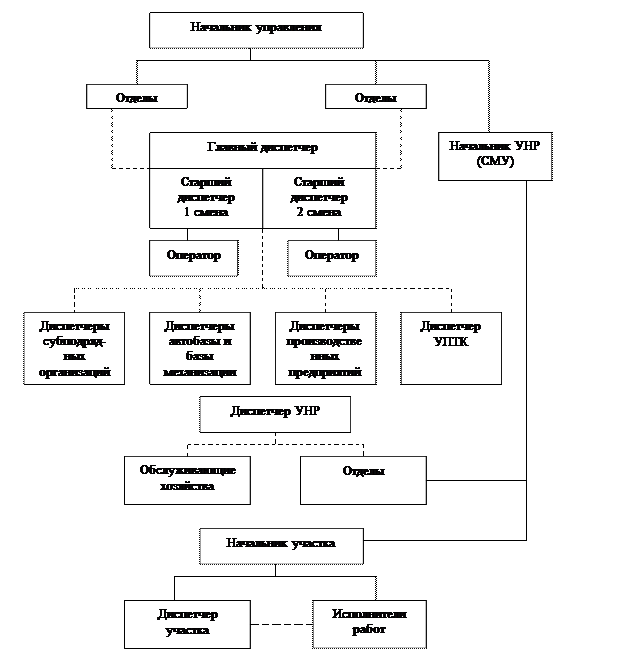Главная диспетчерская треста является составной частью производственного отдела, она организует всю работу по недельно-суточным графикам, освобождая от этих обязанностей линейный инженерный персонал. Главная диспетчерская осуществляет руководство через начальников и главных инженеров строительных управлений, начальников отделов треста, директоров предприятий, а также через низовую диспетчерскую сеть. На участках и в цехах производственных предприятий функции диспетчерского управления возлагаются на линейный управленческий персонал. На крупных объектах создаются передвижные диспетчерские пункты, в состав которых входят 1-2 диспетчера.