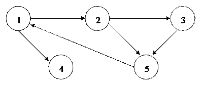 G= (X, А). Обычно вершинам приписывают номера – 1, 2,..., n, а дуги изображают прямыми или кривыми линиями, каждая из которых соединяет ровно две вершины, и обозначают (i, j). Где i, j - вершины, определяющие начало и конец дуги. На рис. 6.1. вершины графа – это кружки с номерами 1, 2, 3, 4, 5. Дуги этого графа: (1, 2), (1, 4), (5, 1), (2, 3), (2, 5), (3, 5).