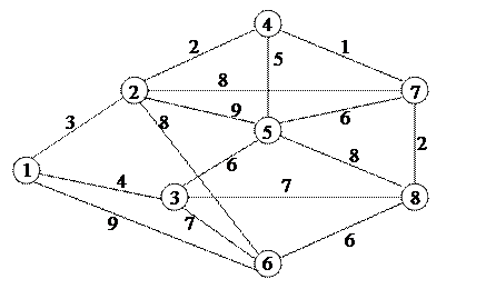 Построенное дерево кратчайших путей состоит из дуг (1, 2), (1, 3), (2, 4), (4, 7), (7, 8) (они помечены на последней сети). Кратчайший путь от узла 1 до узла 8 составляет 8 км, т.к. постоянная пометка этого узла