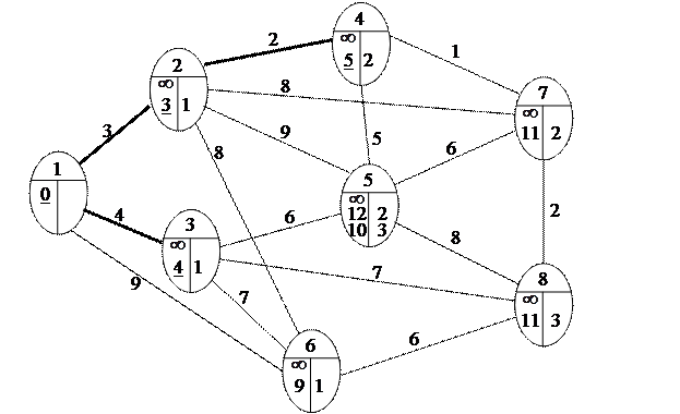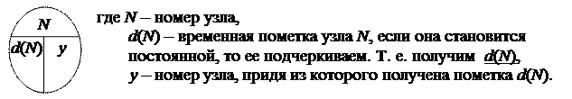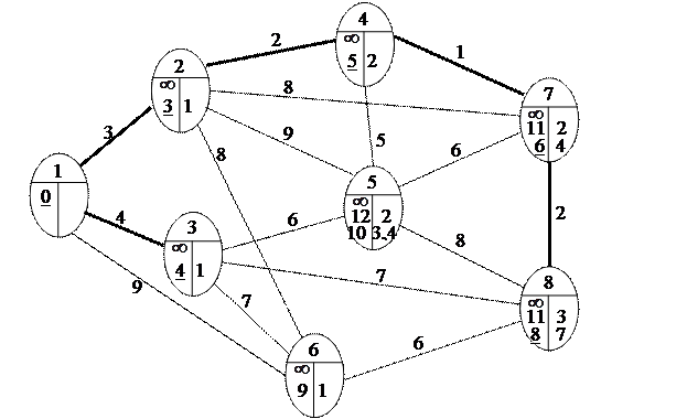 Продемонстрируем работу алгоритма Дейкстры, отмечая временные и постоянные пометки непосредственно в узлах сети. Для этого каждый узел изобразим в виде овала и разделим его на три части следующим образом