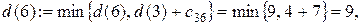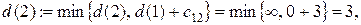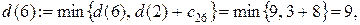 Шаг 2. Узлы 2, 3 и 6 смежные с последним, получившим постоянную пометку узлом 1. Новые значения временных пометок этих узлов будут: