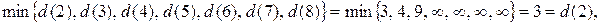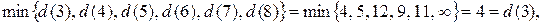 Шаг 2. Узлы 5, 6 и 8 смежные с последним, получившим постоянную пометку узлом 3. Новые значения временных пометок этих узлов будут: