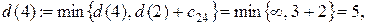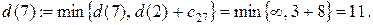Шаг 2. Узлы 4, 5, 6 и 7 смежные с последним, получившим постоянную пометку узлом 2. Новые значения временных пометок этих узлов будут: