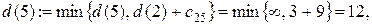 Шаг 2. Рассматриваем все вершины j, смежные с последней получившей постоянную пометку вершиной и имеющие временные пометки. Сравниваем величину временной пометки
