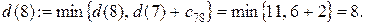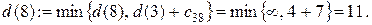 Шаг 2. Узлы 5 и 8 смежные с последним, получившим постоянную пометку узлом 7. Новые значения временных пометок этих узлов будут: