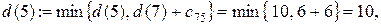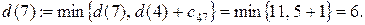 Шаг 2. Узлы 5 и 7 смежные с последним, получившим постоянную пометку узлом 4. Новые значения временных пометок этих узлов будут: