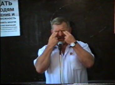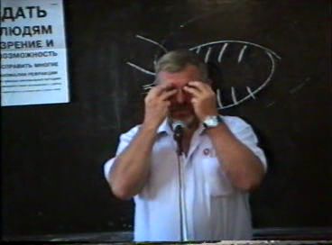 Двумя пальцами [от автора сайта: средним и указательным] вы закрываете глаза, накладываете на верхнее веко, нажимаете, вдавливаете, и вибрируете вперед-назад [от автора сайта: т.е. пальцами нажимаем на глазное яблоко, отжимаем, нажимаем, отжимаем, нажимаем, отжимаем]. Нажать, повибрировать вперед-назад [от автора сайта: Жданов положил пальцы на веки, понажимал на глаза, потом убрал пальцы с век. И снова — три раза.].