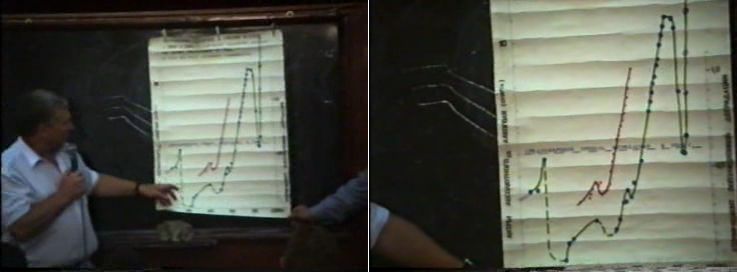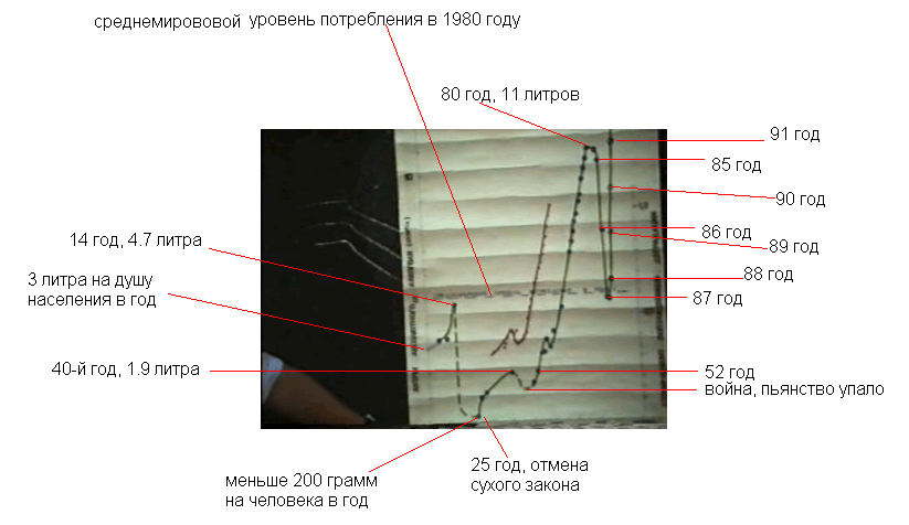 Многие из вас, соратники, помнят, что пятнадцать лет назад, в 85-м году, были приняты так называемые антиалкогольные постановления партии и правительства. И в тех постановлениях было сказано, что проблемы связанные с алкоголепотреблением в нашей стране резко обострились, а пьянство и алкоголизм достигли угрожающих масштабов. Вот эту тревогу отражает график, плакат, на котором изображено душевое употребление алкоголя с 1900-го по 2000-й год. В России, СССР.