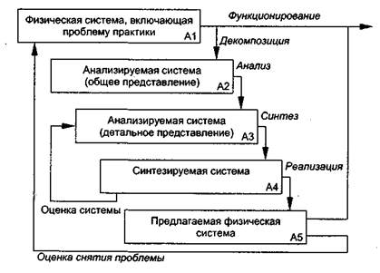 При этом в процессе функционирования реальной системы выявляется проблема практики как несоответствие существующего положения дел требуемому. Для решения проблемы проводится системное исследование (декомпозиция, анализ и синтез) системы, снимающее проблему. В ходе синтеза осуществляется оценка анализируемой и синтезируемой систем. Реализация синтезированной системы в виде предлагаемой физической системы позволяет провести оценку степени снятия проблемы практики и принять решение на функционирование модернизированной (новой) реальной системы.