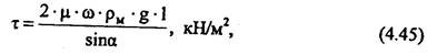 где p*g - удельный вес закладочного материала, кН/м3; Η - геодезическая глубина заложения опоры, м; μ - коэффициент трения материала опоры о стенки выработки; ω - коэффициент бокового распора; рм - плотность материала опоры, кг/м3; 1 - длина опоры, м Тогда из уравнений (4.44) и (4.45)