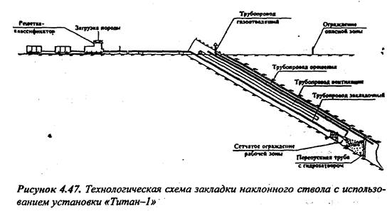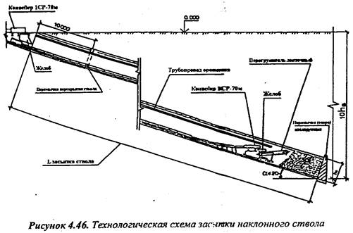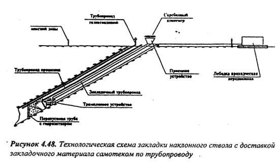 Южгипрошахтом в проектах ликвидации ряда шахт предложено несколько технологических схем закладки наклонных стволов, обеспечивающих высокое качество работ (забутовку по всему сечению с уплотнением закладочного материала) при минимальном количестве вспомогательных операций.
