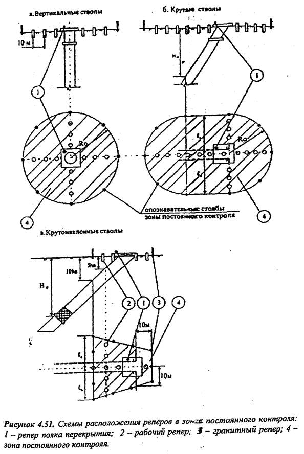 Зоны постоянного контроля устанавливаются для ликвидированных крутых и крутонаклонных стволов, скважин, то есть при углах наклона выработок, когда возможен перепуск пород (рис. 4.51). Границы зон оконтуриваются железобетонными опознавательными столбами, устанавливаемыми через 5-10 м на криволинейных участках. Величина заглубления столба в почву 1 м, длина выступающей над поверхностью части - 0,5 м. Как уже отмечалось согласно рекомендации «Правил...» зоны постоянного контроля ограничиваются у вертикальных стволов радиусом R„ = 20 м от центра ствола при мощности наносов hн = 20 м и радиусом Ro = hн, не более 40 м, если hн>20 м.