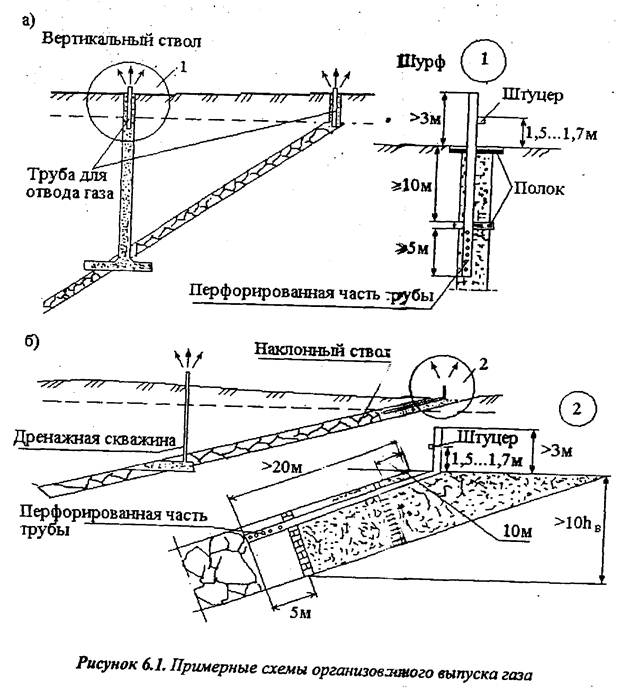 Наиболее распространенные (типовые) схемы отвода газа из ликвидируемых шахт показаны на рисунке 6.1. Сущность заключается в том, что в верхней части вскрывающих выработок в закладочном материале размешаются газоотводящие трубы (см. рис.4.3, 4.4). Другие выработки, имеющие выход на дневную поверхность, по возможности подлежат дополнительной изоляции в виде тампонирования.