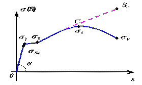 Рис.2. Условная (σ(ε) - сплошная) и истинная (S(ε) - пунктирная) диаграммы упрочнения образца из пластичного металла при растяжении. (σ – условные механические напряжения; S – истинные механические напряжения; ε – относительная деформация).