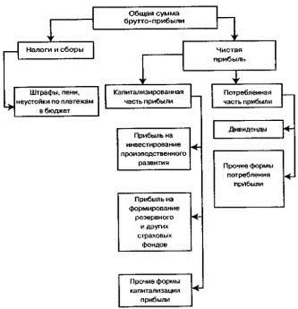 Для анализа используются закон о налогах и сборах, взимаемых в бюджет, инструктивные и методические указания Министерства финансов, устав предприятия, а также данные отчета о прибылях и убытках, приложения к балансу, отчета о движении капитала, расчетов налога на имущество, на прибыль, на доходы и др. Распределение прибыли показано на рис. 11.1. Из рисунка видно, что одна часть общей суммы брутто-прибыли в виде налогов и сборов поступает в бюджет государства и используется на нужды общества. Оставшаяся сумма – чистая прибыль, используется на выплату дивидендов акционерам предприятия, на расширение производства, материальное поощрение работников, пополнение собственного оборотного капитала и т.д. Оптимальное распределение прибыли с учетом интересов государства, предприятия, работников является залогом стабильности и направлено на повышение эффективности деятельности предприятия в целом и обеспечения его привлекательности для инвесторов. Нераспределенная прибыль используется в соответствии с Уставом предприятия. За счет ее выплачиваются дивиденды акционерам предприятия, создаются фонды накопления, потребления, резервный фонд, часть прибыли направляется на пополнение собственного оборотного капитала и на другие цели В процессе анализа необходимо изучить факторы изменения величины налогооблагаемой прибыли, суммы выплаченных дивидендов, процентов, налогов из прибыли, размера чистой прибыли, отчислений в фонды предприятия. Рис. 11.1. Общая схема распределения прибыли
