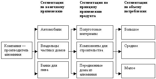 Сегментация может осуществляться также при последовательном применении нескольких критериев. Важно, чтобы сегменты не оказались слишком малочисленными, т.е. невыгодными для коммерческого освоения. В качестве примера, на рис. 2 приводится фрагмент результатов последовательной трехступенчатой сегментации рынка потребителей алюминия.