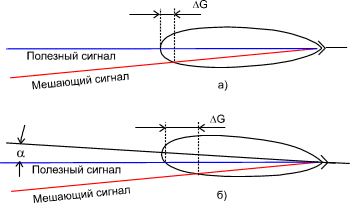 Принцип отстройки от мешающих сигналов иллюстрируется рис. 10.1. Видно, что при повороте антенны на угол a, коэффициент усиления для полезного сигнала, уменьшается на небольшую величину, в то время как для мешающего сигнала падение усиления существенно. Обычно оптимальная величина угла a определяется следующим соотношением: