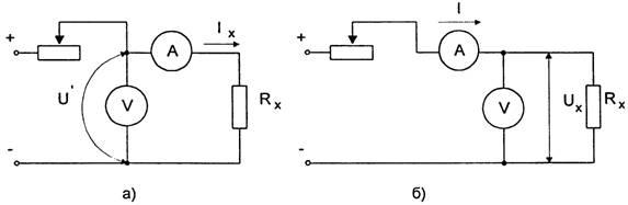 Рис. Схема измерения больших (а) и малых (б) сопротивлений методом амперметра-вольтметра.
