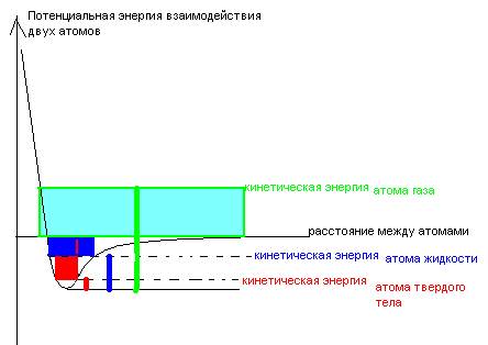 Цветными линиями показаны диапазоны изменениями кинетической энергии для каждого агрегатного состояния, цветными прямоугольниками – диапазоны колебания межатомных расстояний для различных агрегатных состояний. В случае газа показана только часть диапазона.