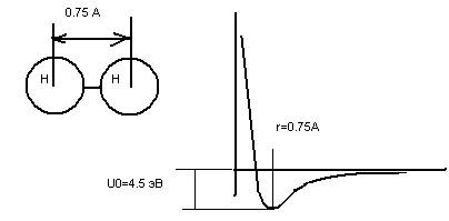 Глубина потенциальной ямы – 4.5 эВ (1эВ –энергия, которую приобретает электрон при прохождении разности потенциалов в 1 вольт. 1 эВ=1.6 *10-12эрг). Рассмотрим еще две двухатомные молекулы – O2 и Cl2. Расстояние между центрами атомов для молекулы кислорода O2 равно 1.2 А, глубина потенциальной ямы 5.1 эВ, для Cl2, соответственно, 2А и 2.5эВ.